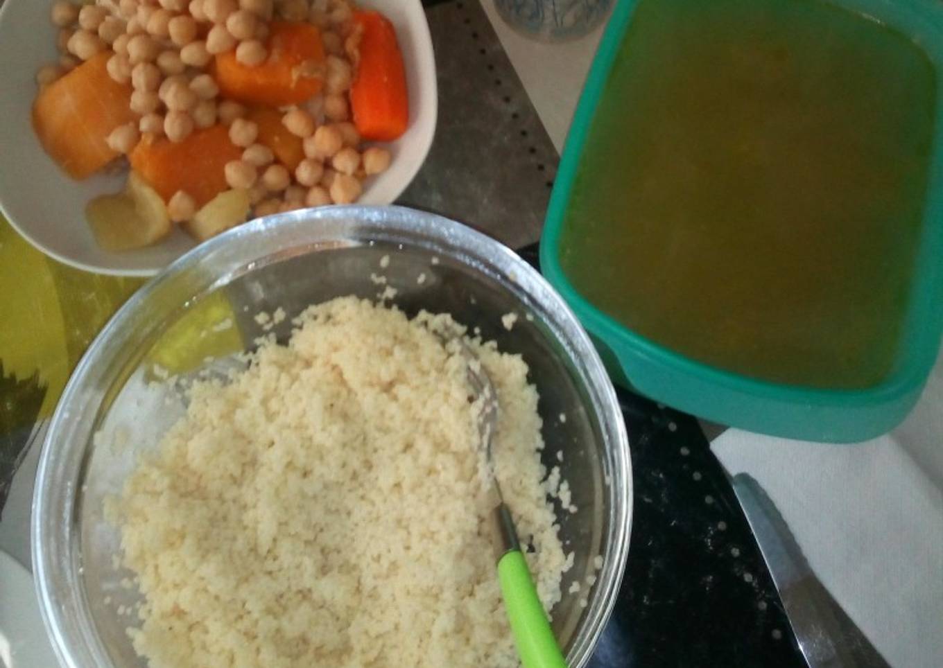 - Mientras se cuece el caldo, durante aproximadamente una hora u hora y media, se prepara el cous cous como indique el fabricante.