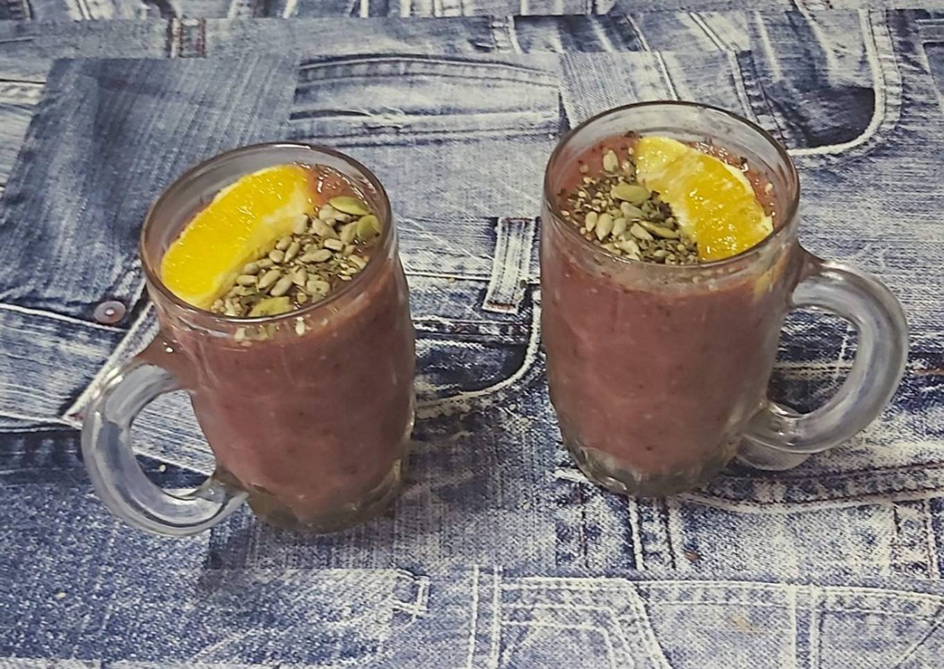 las semillas, las avellanas y las uvas pasas. Batimos hasta conseguir la densidad deseada. - Presentamos y decoramos con las semillas variadas, el gajo de naranja y
