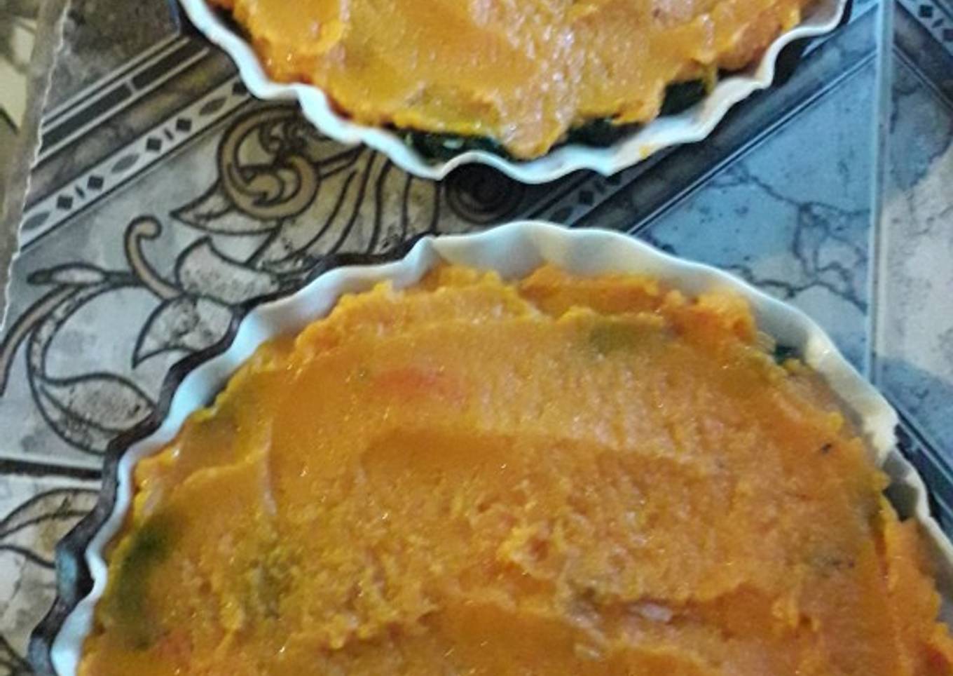 - Se rellena la tarta, luego se hace un puré con la calabaza y se pone arriba de la espinaca y por último lo metemos al horno por 25 minutos