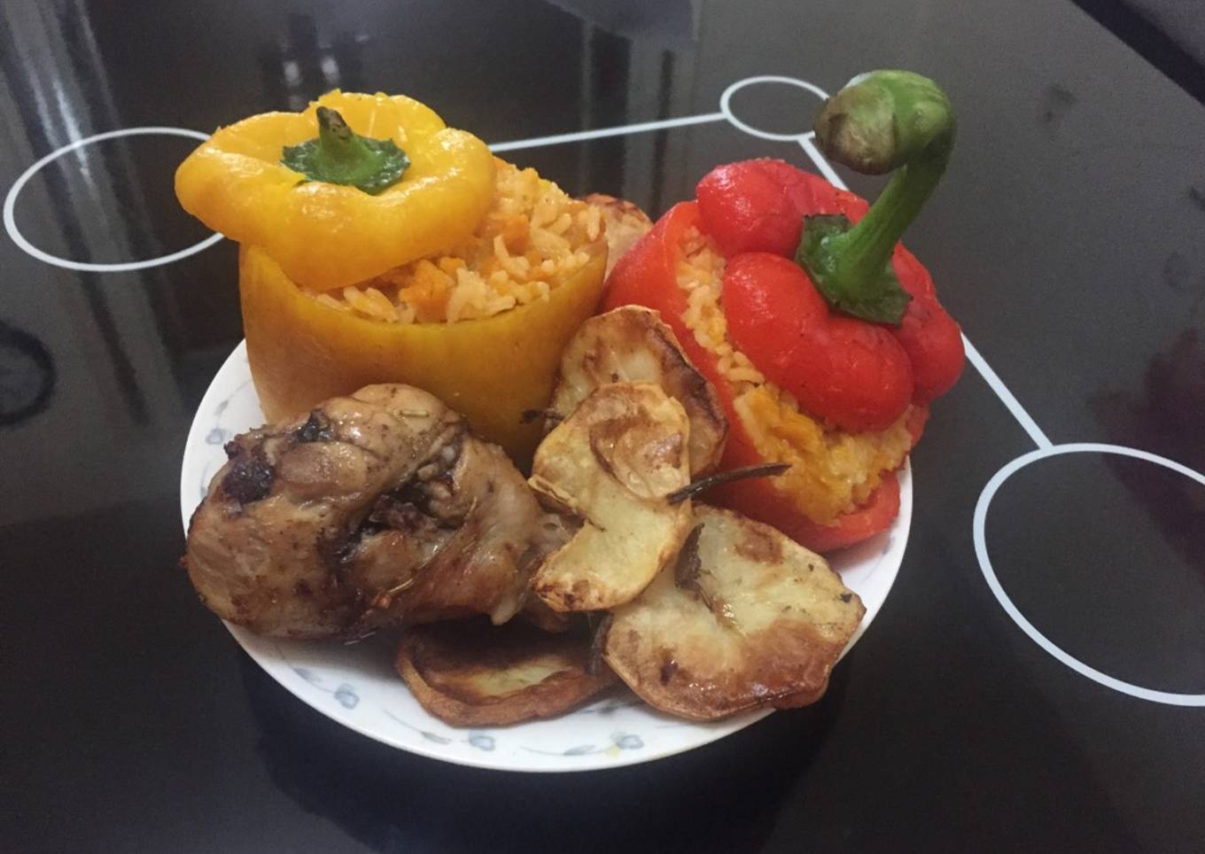 - Una vez listo el arroz, asamos los ajíes, los limpiamos y cortamos como en la Foto y luego rellenamos con el arroz. Y servimos acompañados del pollo asado con papas.