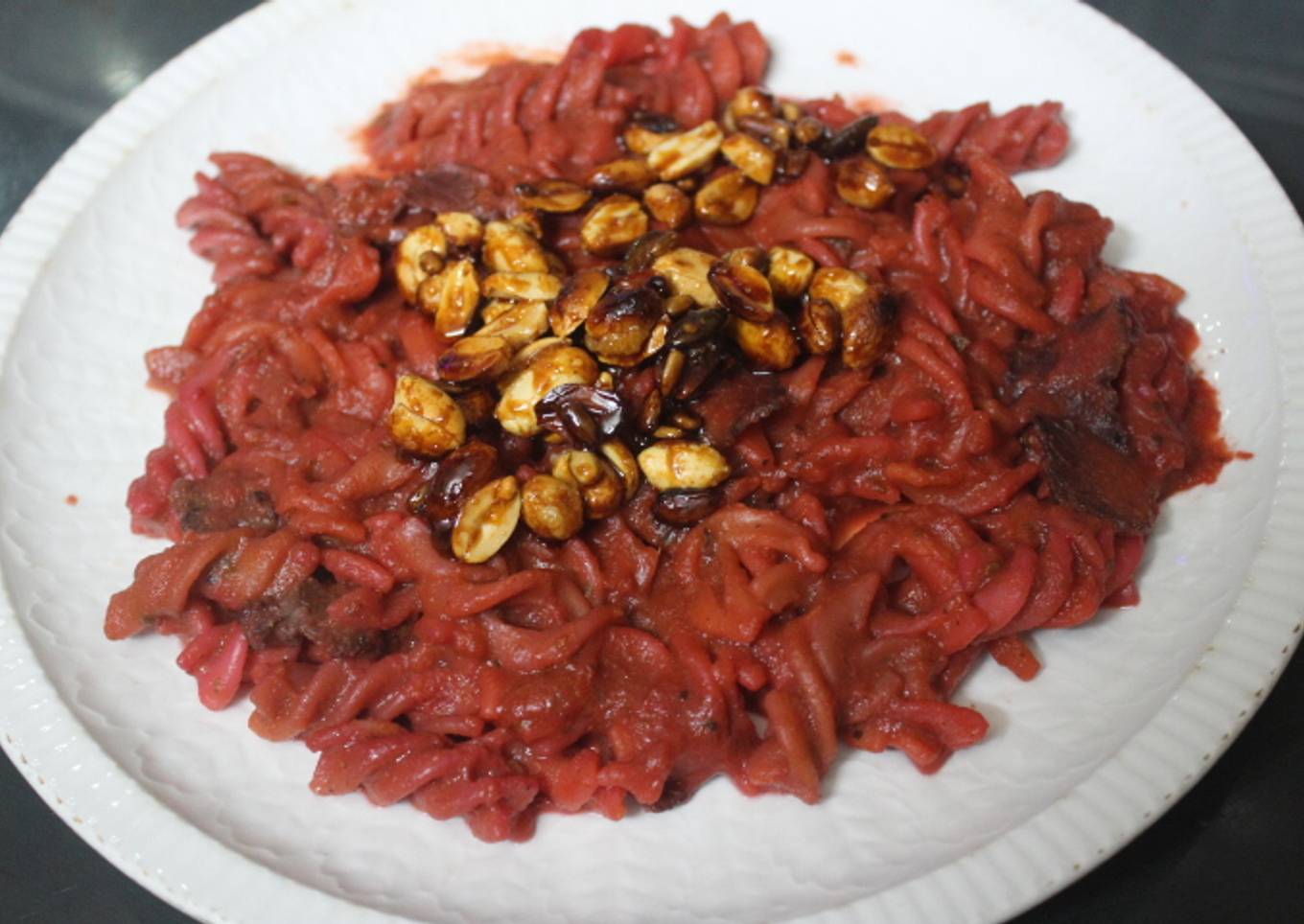 Hoy os traigo un plato espectacular, con muy poco trabajo, partiendo de unas simples hélices de pasta, un sofrito congelado y unos frutos secos un poco húmedos glaseados.