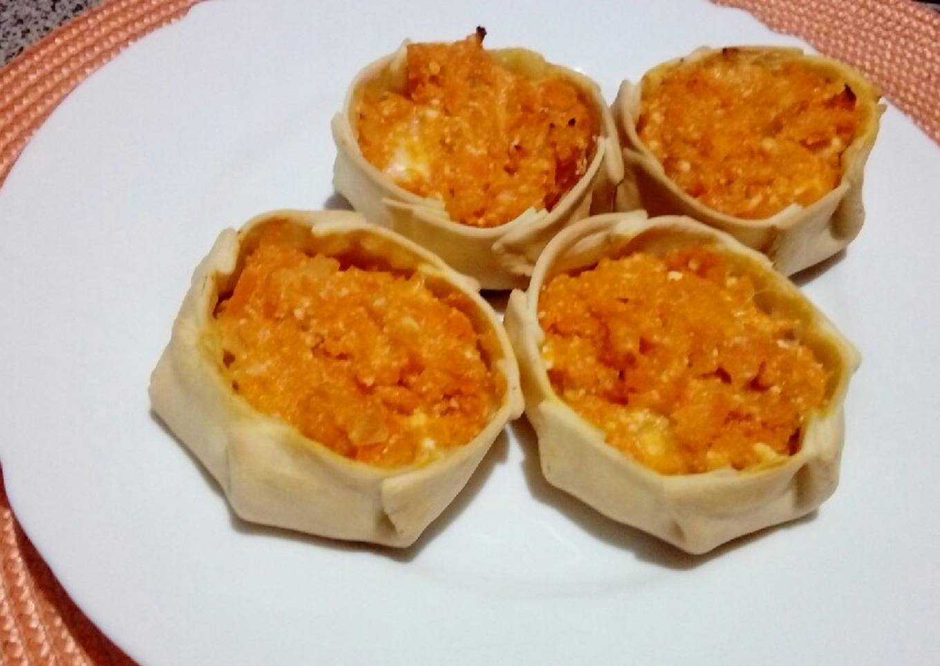 - En un recipiente poner la calabaza cocida y aplastar con tenedor o pisa papas. Agregar la cebolla y la zanahoria rehogada, la ricotta y el queso cortado en cubos y mezclar. Si fuera necesario agregar muy poquita sal.