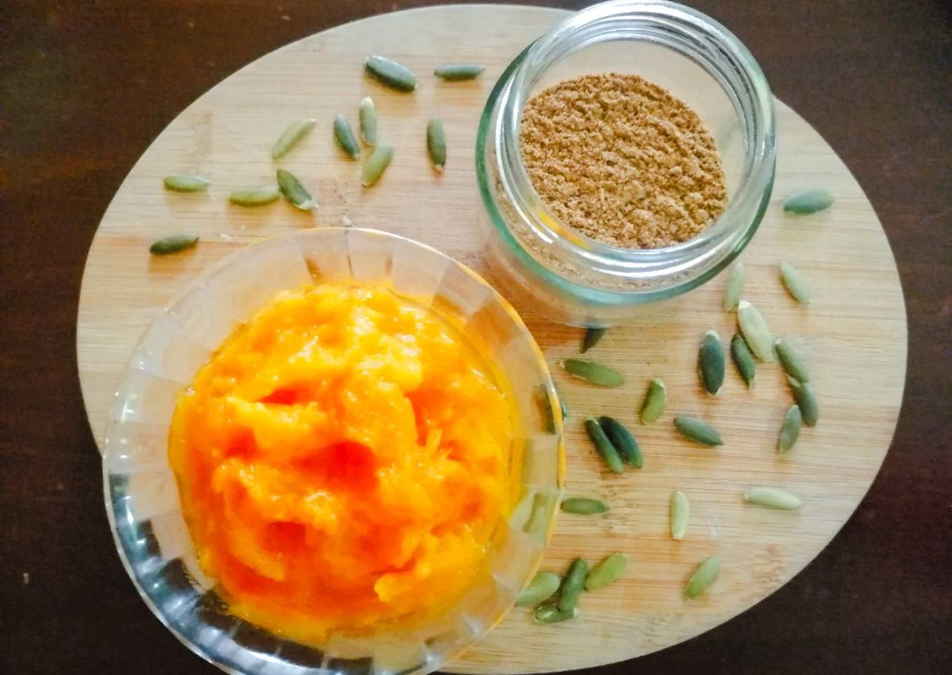 - Dejar enfriar un poco pero sacar la pulpa con una cuchara, aún calientita. Machacar y hacer puré. Guardar en recipiente con tapa, de vidrio de preferencia.