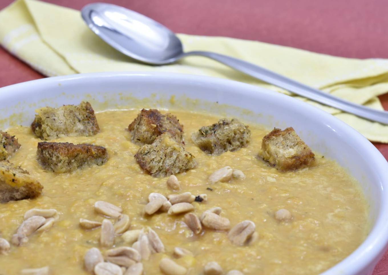 - Servir la sopa, agregarle los crutones y espolvorear con manies.