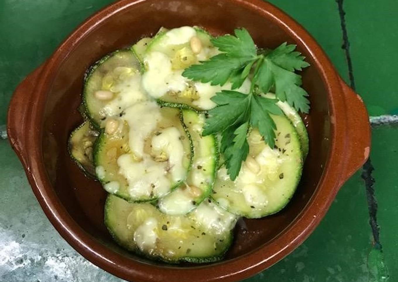 - En el mismo wok ponemos un poco de Pam y ahí salteamos rápidamente unos cuantos piñones y los ponemos por encima de las calabacitas. Finalmente les ponemos un poco de queso rallado y adornamos con una hojita de perejil o de albahaca.