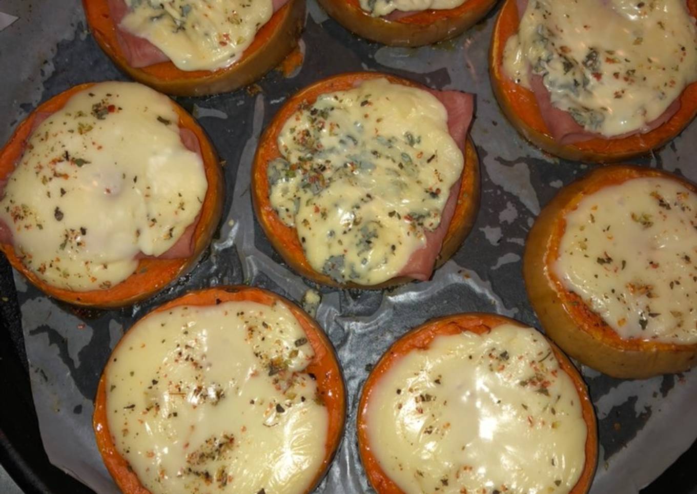 - Cortar en rodajas la calabaza, poner en una bandeja con papel manteca, rociar un poquito de aceite.cocinar a horno 190 hasta que estén tierna.