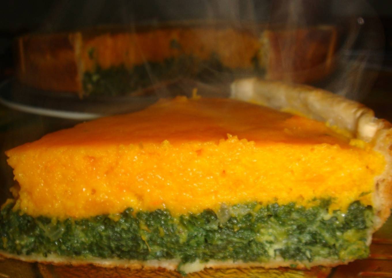 - Forramos una tartera apenas aceitada dejando los bordes altos como de 4 cm., volcamos el relleno de espinaca sobre la base de masa, emparejamos y colocamos sobre este el relleno de calabaza, emparejamos y al horno.