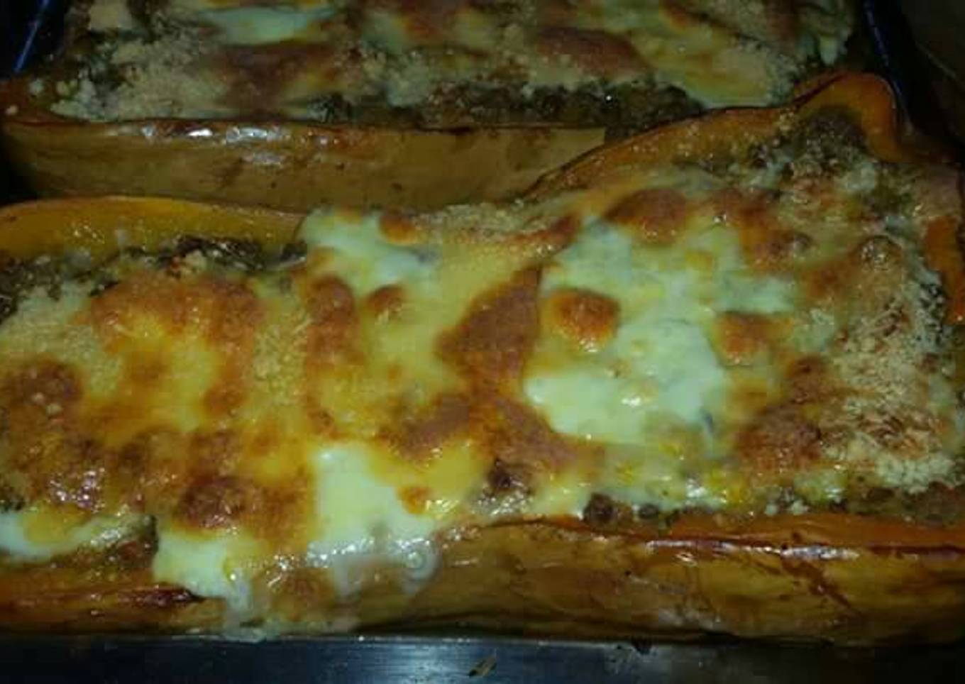 - Rellenamos la Calabaza, cubrimos con Queso crema y muzzarella. Espolvoremos con un poco de orégano, llevamos al horno para gratinar.